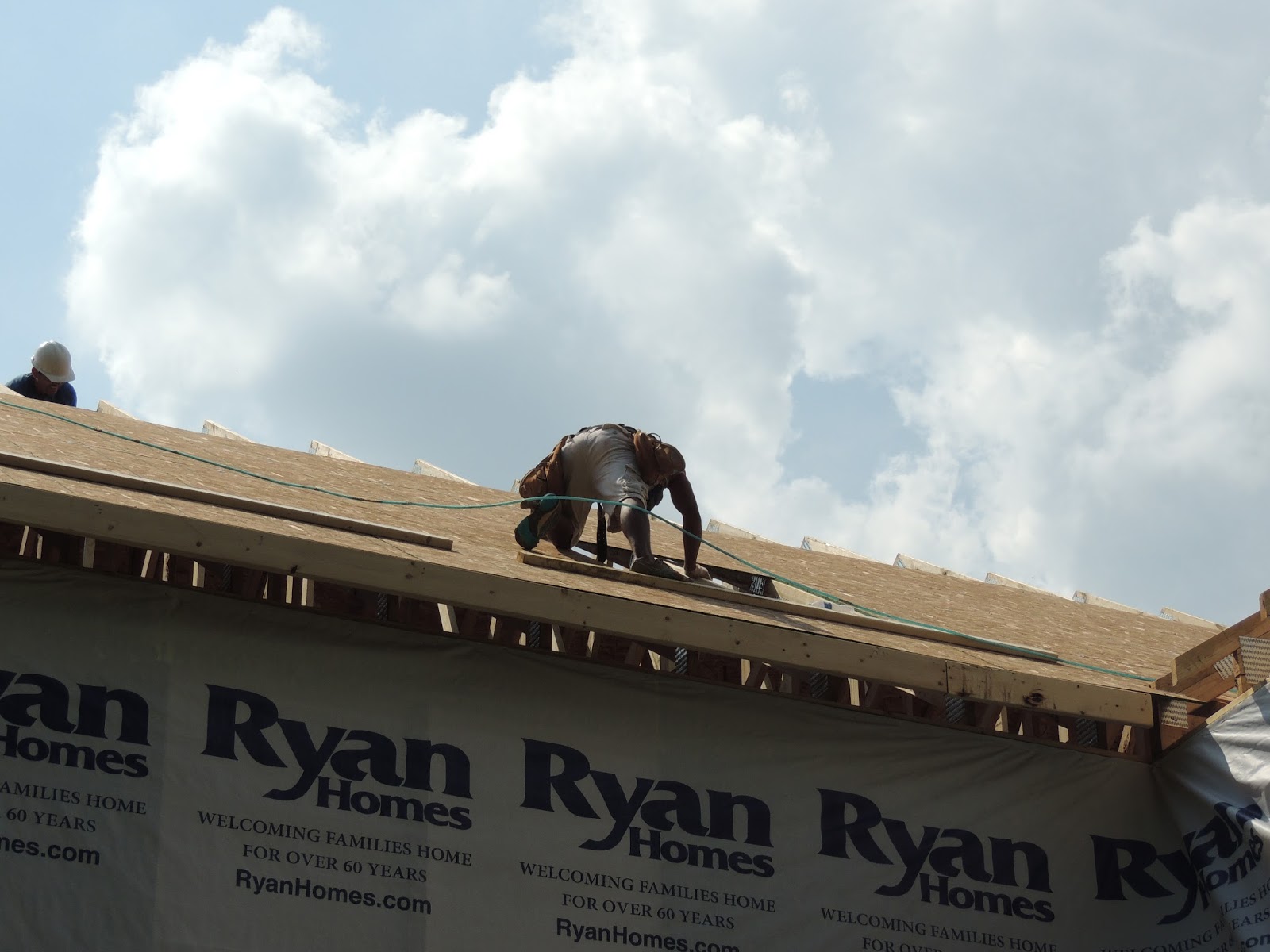 Our PM was on vacay this week, so his assistant, Hans, sent us an update. Hans said that they may "Crane the Trusses" by end of Friday or Saturday. I thought it'd be pretty cool to take some pics of that! However, by the time I showed up Fri afternoon, they were up, and the roof framing was well underway. It was still great to watch the three men that were working in action - working at top speed in the blazing sun, maneuvering effortlessly on the incomplete roof!